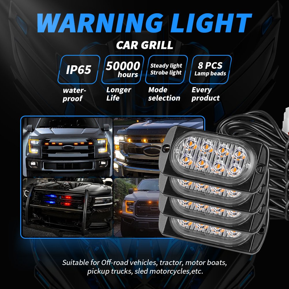 Tenraytech 1 to 4 32LED Car Grille Strobe Warning Light, 4PCS×8LED High Brightness Grille Light 12V